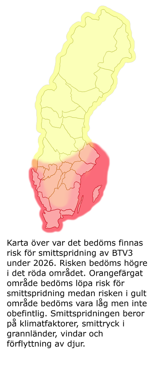 - Under våren 2025 föddes i sydvästra Sverige kalvar med missbildningar i hjärnan efter att korna smittats med BTV3 under dräktigheten. Dessa kalvar föddes även i områden med få rapporterade kliniska fall under 2024.